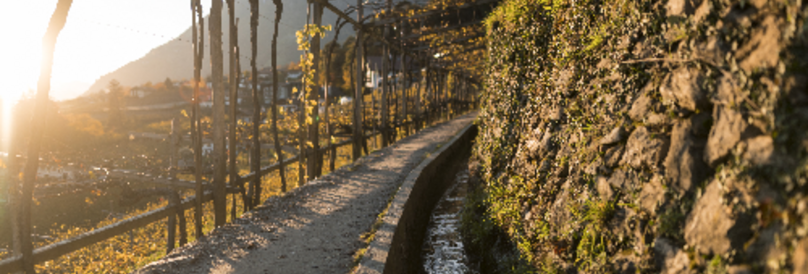 One level higher than the promenade, between 500 and 800 metres above sea level, you'll find the renowned irrigation channels (Waalwege). Due to the lack of rainfall in Burgraviato, intelligent irrigation channels have been developed over the course of the centuries. The very enchanting hike along these water channels leads through orchards, vineyards, forests and meadows. Our tips: Lagundo irrigation channel, Maia irrigation channel, Verdins irrigation channel, Caines irrigation channel, Marlengo irrigation channel.